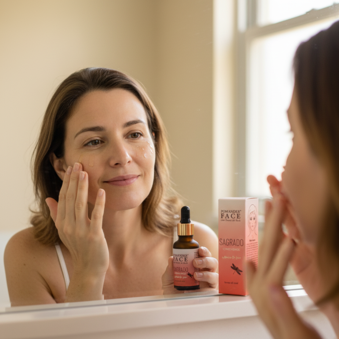 Mergulhe em uma experiência sensorial única com o Pomander Face Sagrado Serum Oil Facial, uma verdadeira dádiva para sua pele. Este óleo facial luxuoso é cuidadosamente formulado com um blend de nobres óleos naturais de Rosa Mosqueta, Jojoba, Gerânio, Sândalo e Cedro, proporcionando uma jornada de rejuvenescimento e vitalidade para sua pele. 💛